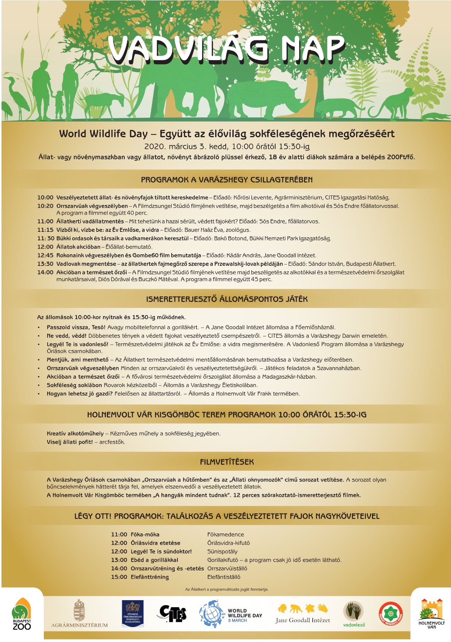 A vadvilág napja alkalmából március 3-án, kedden állatbemutatókkal, látványetetésekkel, filmvetítésekkel, kreatív alkotóműhellyel, állomáspontos játékkal és több más programmal várják az érdeklődőket a Fővárosi Állat- és Növénykertben.