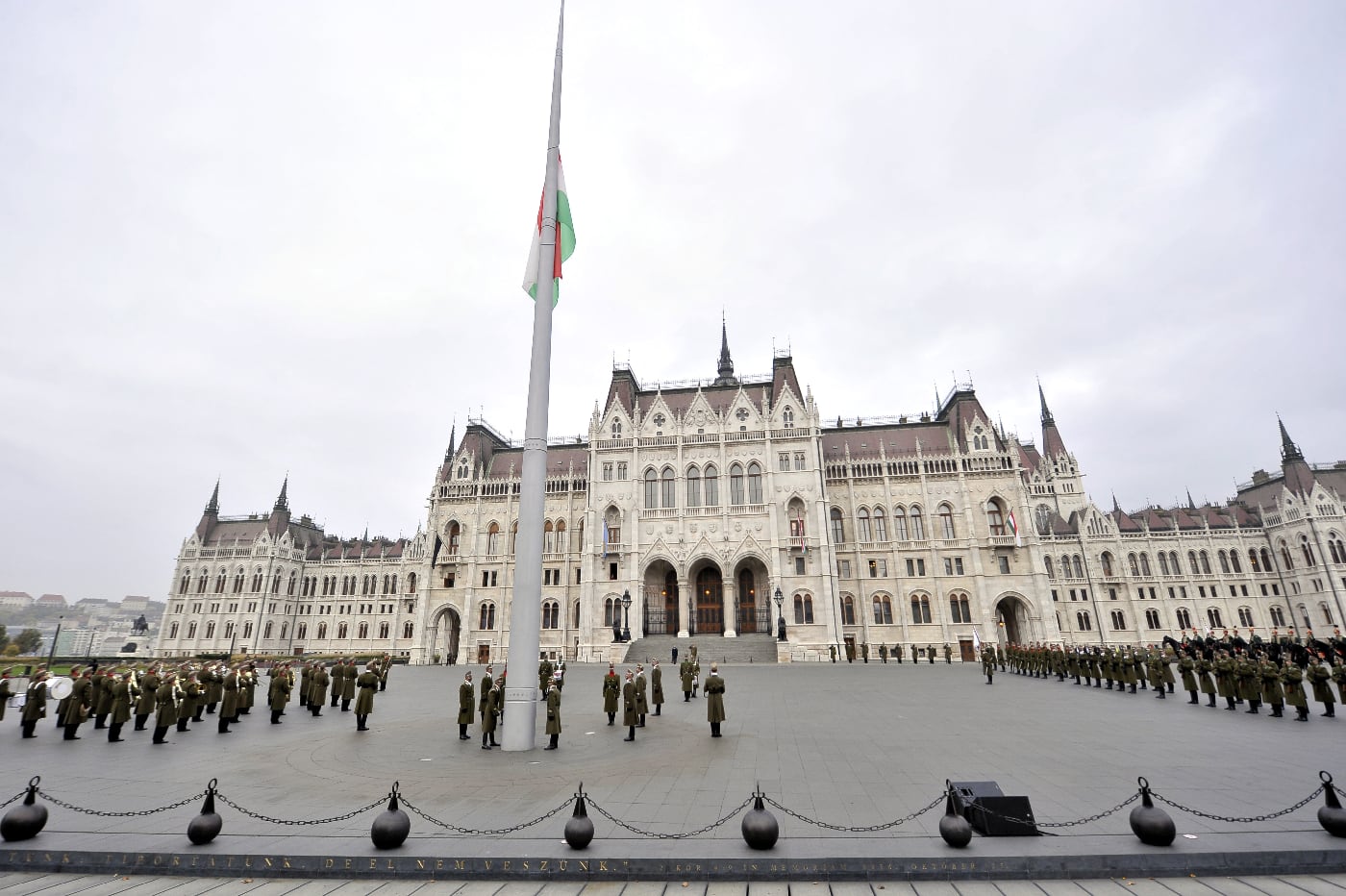 Katonai tiszteletadás mellett Benkő Tibor honvédelmi miniszter és Korom Ferenc, a Magyar Honvédség parancsnoka jelenlétében felvonták, majd félárbócra engedték Magyarország nemzeti lobogóját az 1956-os forradalom és szabadságharc leverésének 64. évfordulóján, szerda reggel Budapesten, a Parlament előtti Kossuth Lajos téren.