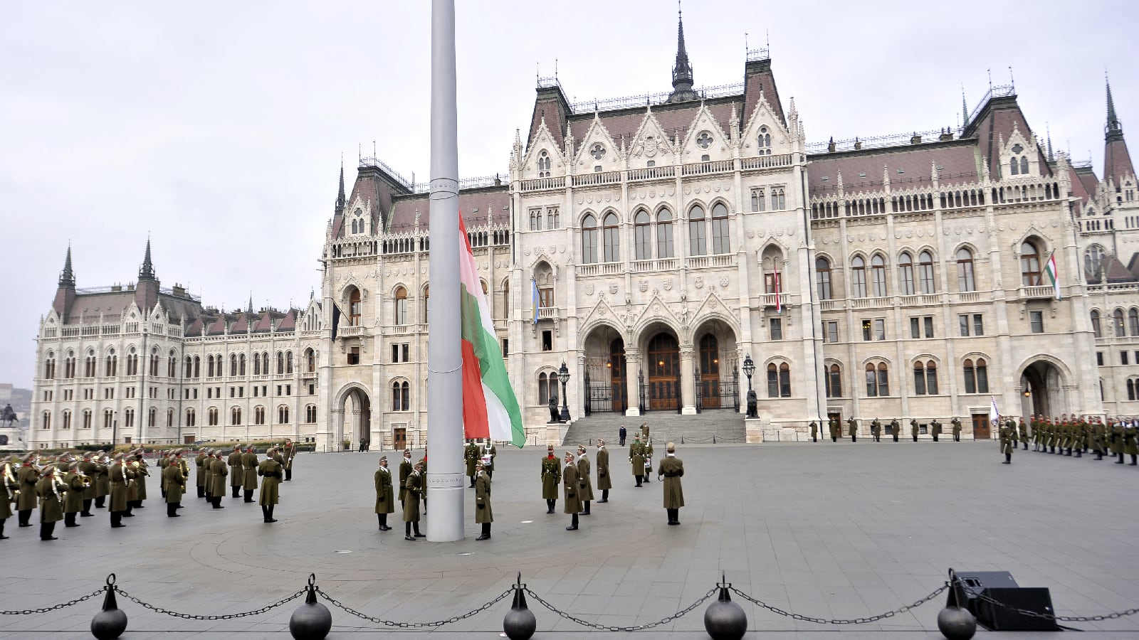 A lobogót a Himnusz hangjaira a honvédség díszegysége vonta fel, majd a Szózat zenéjére eresztették félárbócra.