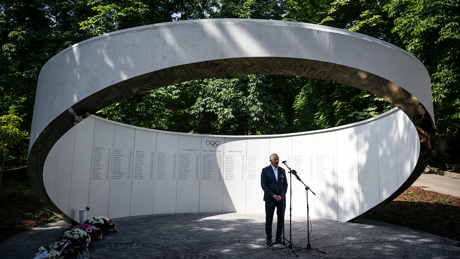 Az elhunyt olimpiai bajnokok új emlékfala a Farkasréti temetőben az ünnepélyes felavatása napján, 2024. július 10-én. MTI/Mónus Márton