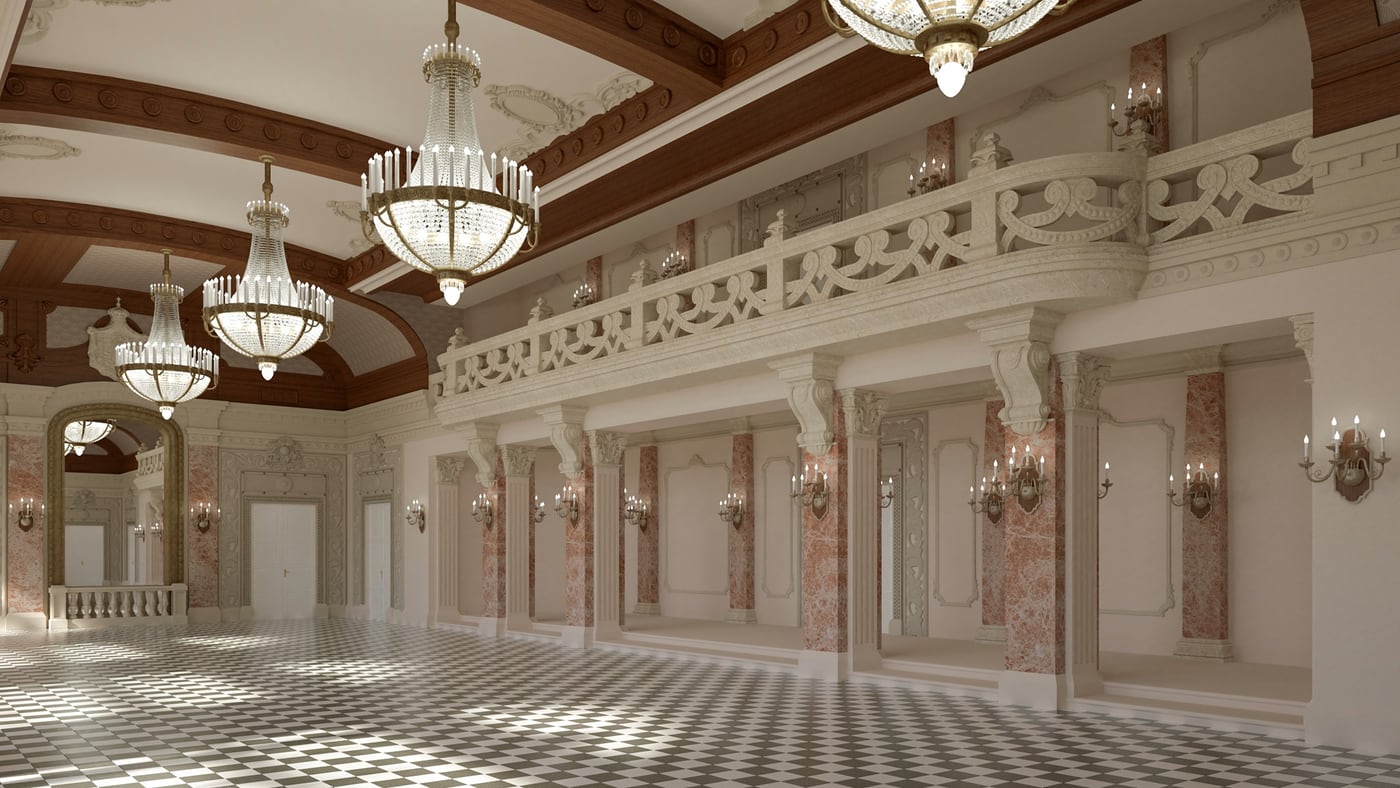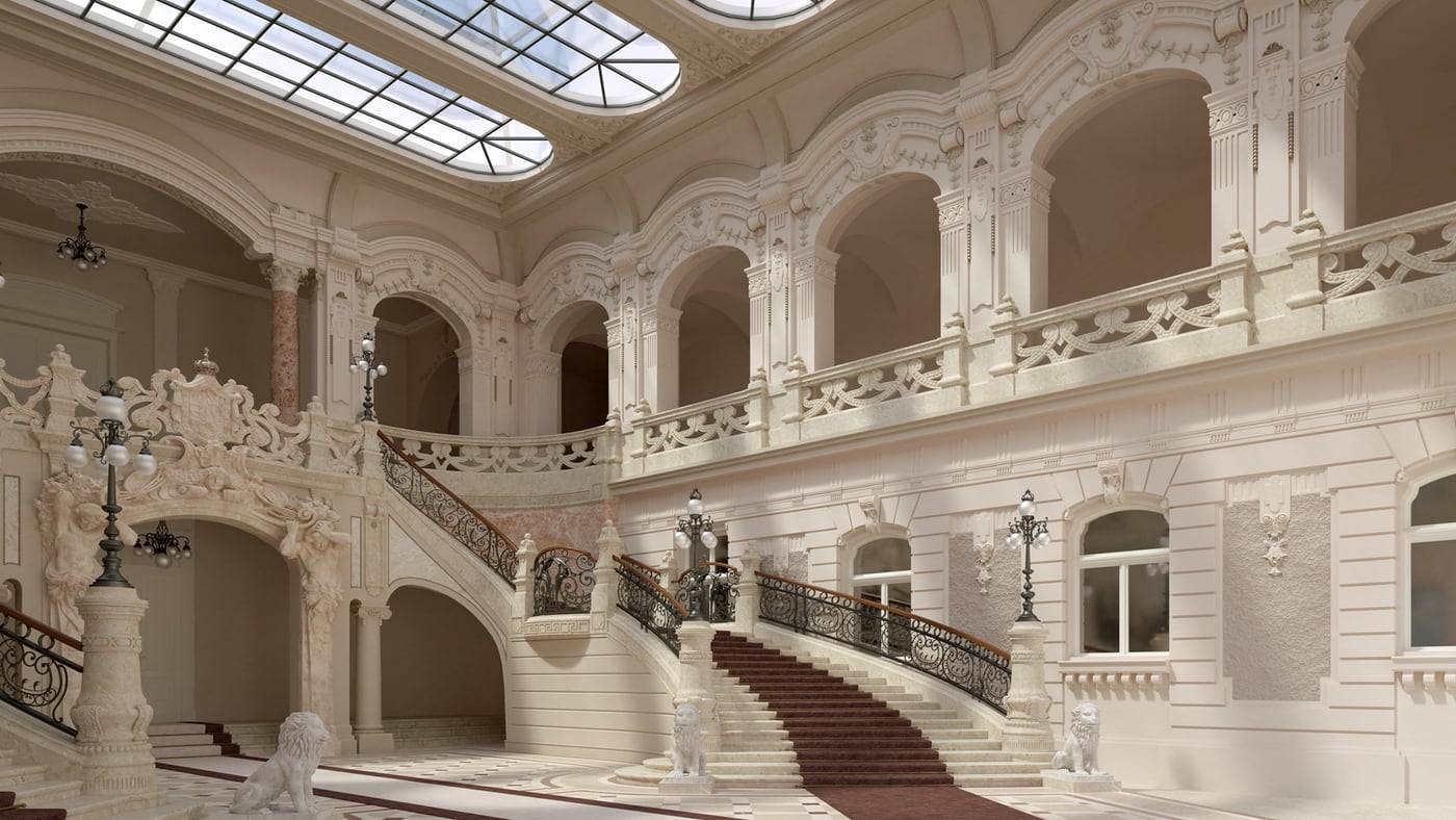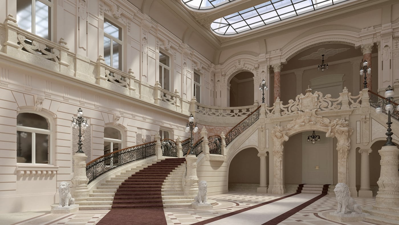 A külső homlokzat mellett a palota főbejárata mögötti pompás, üvegtetejű díszlépcsőházat is korhűen rekonstruálják, amely újra felvezet majd a két emelet magasságú díszterembe.