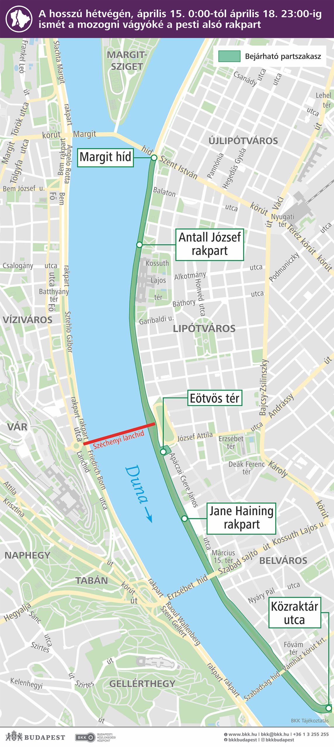 A hosszú hétvégén, nagypéntektől húsvét hétfőig ismét a pihenni, mozogni vagy edzeni vágyóké a pesti alsó rakpart. A gyalog és mikromobilitási eszközzel, például kerékpárral vagy rollerrel közlekedők – a bevált gyakorlatnak megfelelően – a Margit híd és a Közraktár utca között vehetik birtokba a pesti alsó rakpartot. Erre az útszakaszra csütörtöktől péntekre virradó éjszakától egészen hétfő este 23 óráig nem hajthatnak be a gépjárművel közlekedők – írta közleményében a BKK.