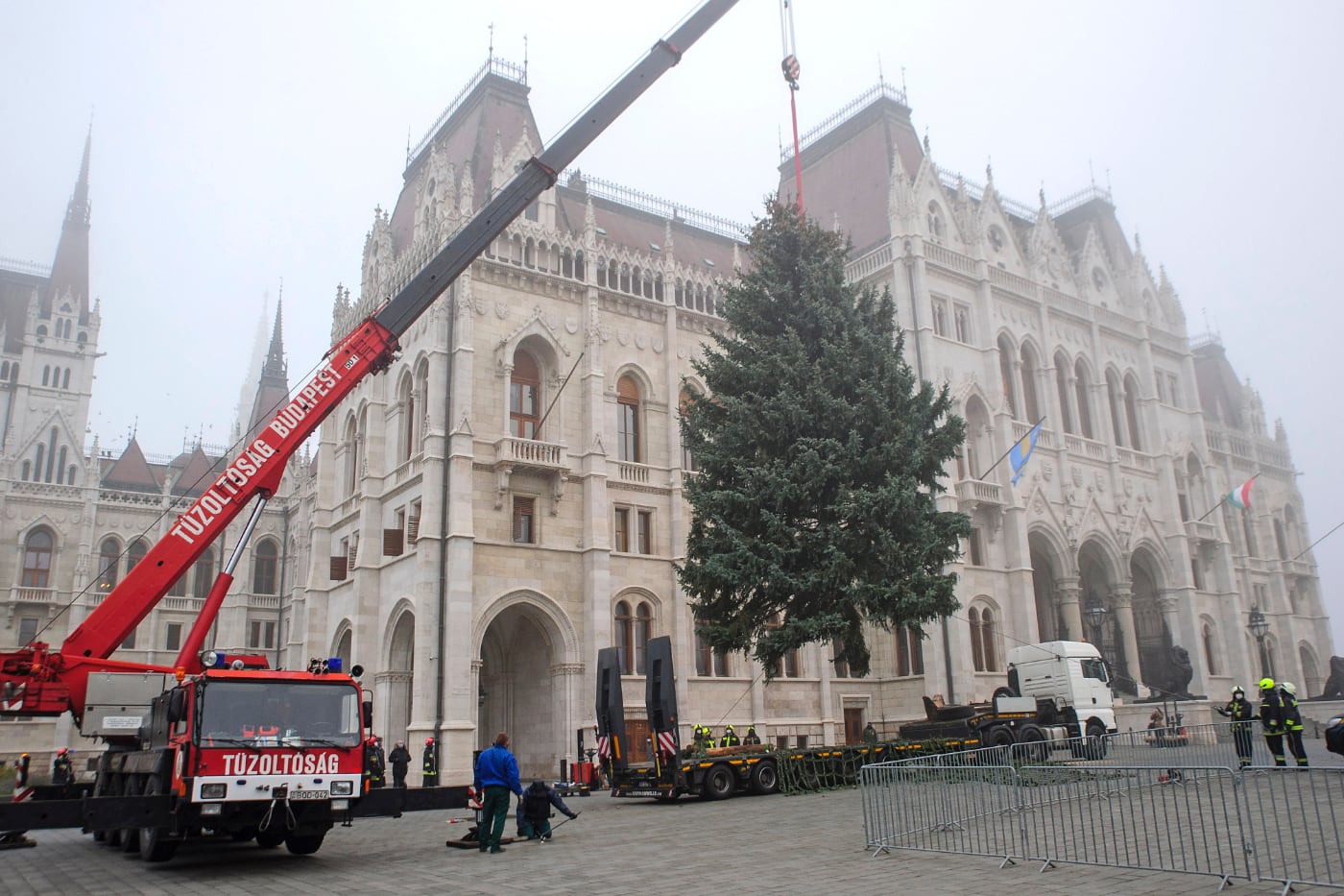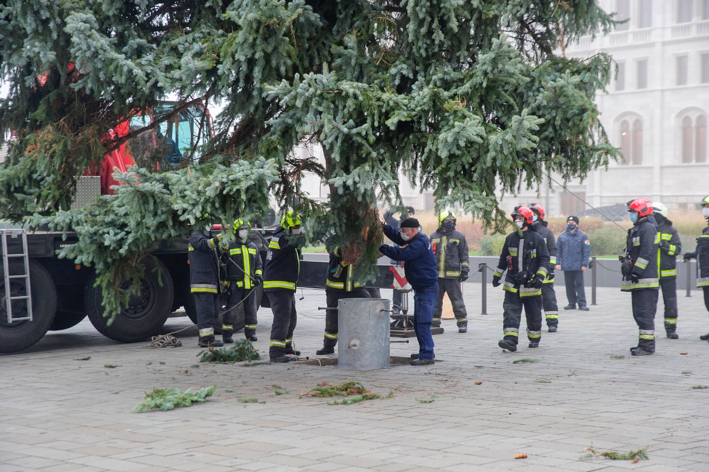 Daruval emelték a helyére a tűzoltók az ország karácsonyfáját az Országház előtt 2020. november 24-én.