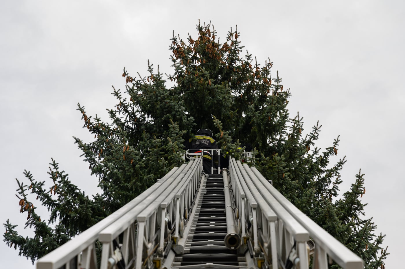 Kötelet rögzítenek a kivágás előtt az ország karácsonyfájának felajánlott fenyőhöz tűzoltók Székesfehérváron 2020. november 23-án. Fotó © Vasvári Tamás | MTI