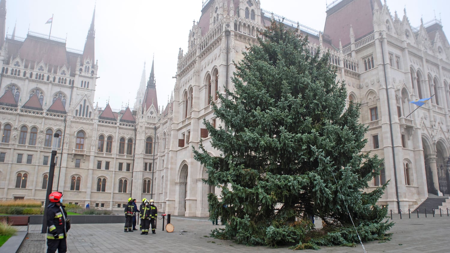 Daruval emelték a helyére a tűzoltók az ország karácsonyfáját az Országház előtt 2020. november 24-én.