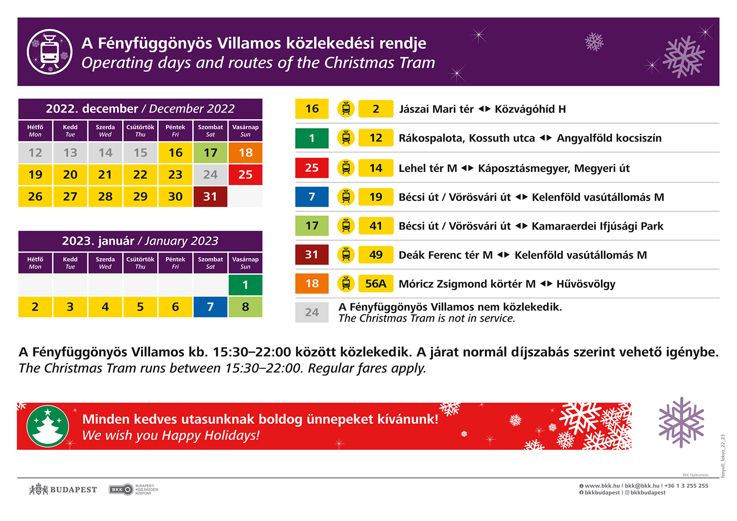A Fényfüggönyös Villamos 2022. december 16-án indul és 2023. január 8-ig szállítja utasait. Kivilágítással minden nap kb. 15.30 és 22 óra között közlekedik.