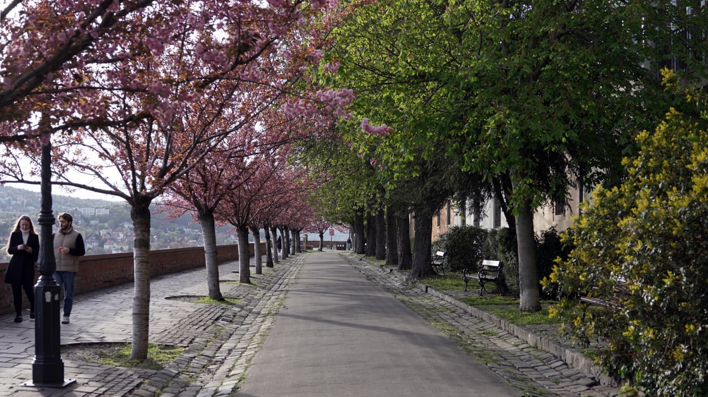 Itt, a Várhegy platóján húzódó, fákkal szegélyezett útvonalon a díszcseresznyefák virágzása egyszerre mesés és megindító élmény.