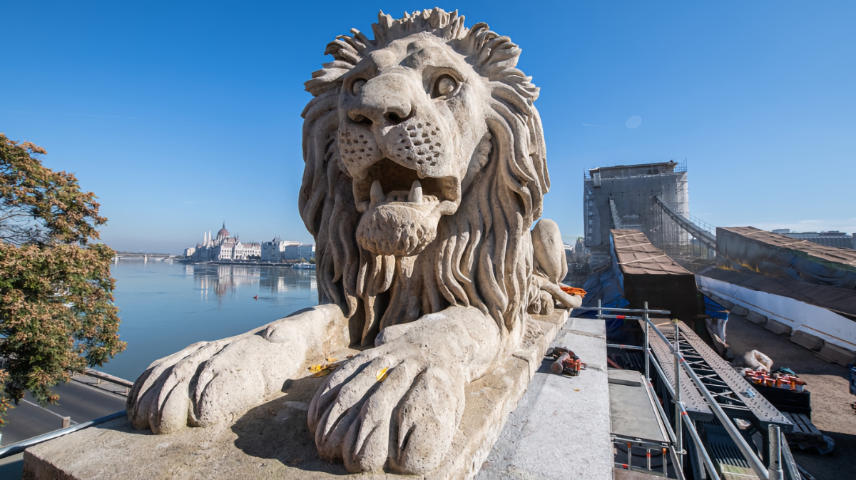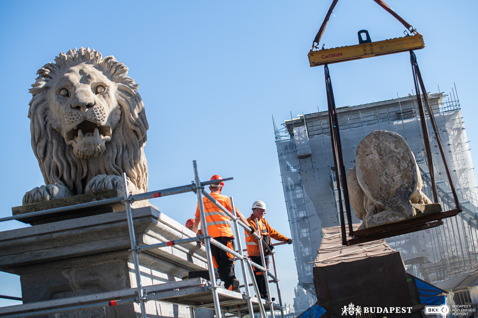 Újabb látványos szakaszához ért a Lánchíd felújítása: a budai hídfőket őrző, egyenként több mint 10 tonnás oroszlánszobrok október 18-án, kedden három teherautó segítségével visszatértek a helyükre.