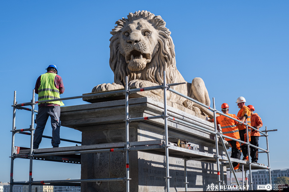 A pesti szobrok néhány héten belül követik a budai társaikat. Az oroszlánok talapzata a Lánchíd felújítása során szintén megújul, a budai oldali talapzat feliratain még dolgoznak a vésnökök, mielőtt aranyozni kezdenék őket.