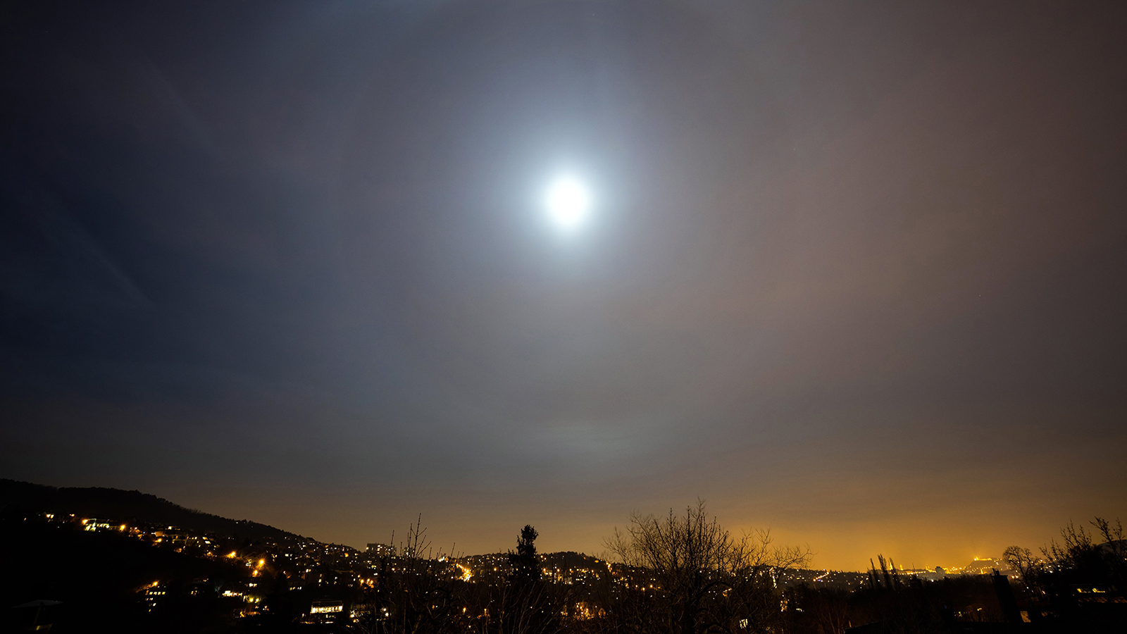 Budapest, 2019. január 22. Halojelenség látszik a Hold körül Budapesten, a Kis-Hárs-hegy felől fotózva 2019. január 21-én. MTI/Mohai Balázs