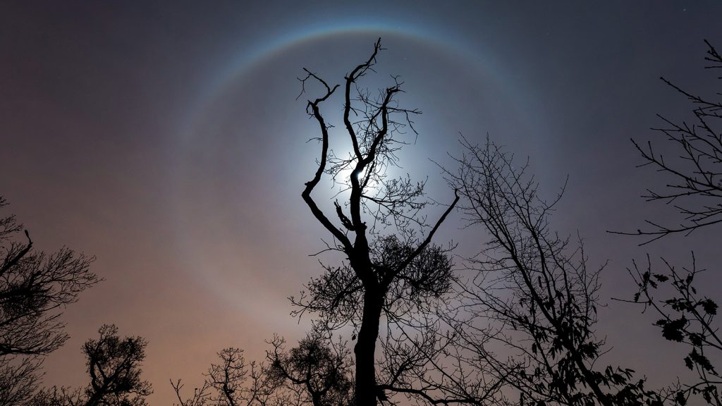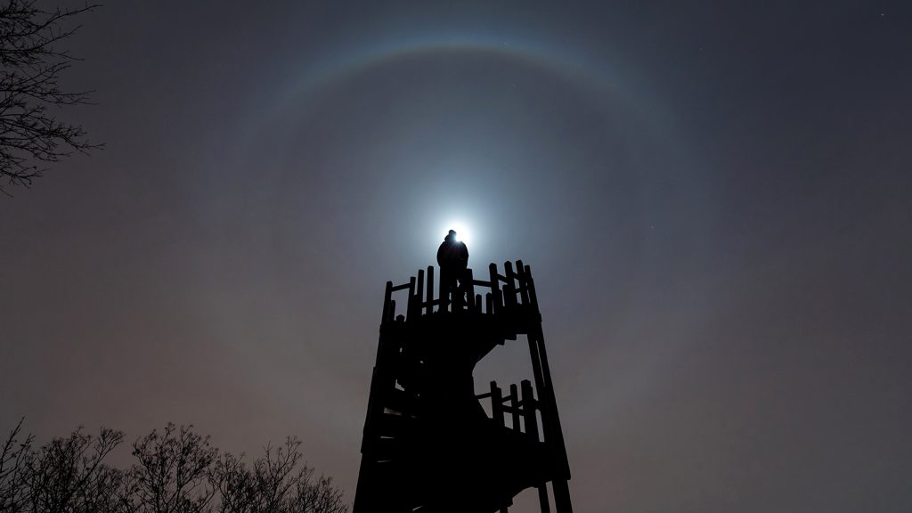 Budapest, 2019. január 22. Halojelenség látszik a Hold körül Budapesten, a Makovecz Imre-kilátó felett a Kis-Hárs-hegyen 2019. január 21-én. MTI/Mohai Balázs