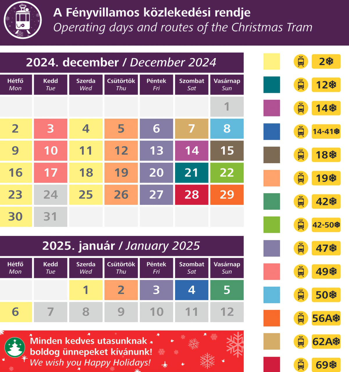 Az adventi időszak egyik legnépszerűbb látványossága, a fényárban úszó villamos, több útvonalon közlekedik Budapest utcáin, ünnepi hangulatot varázsolva a városba.